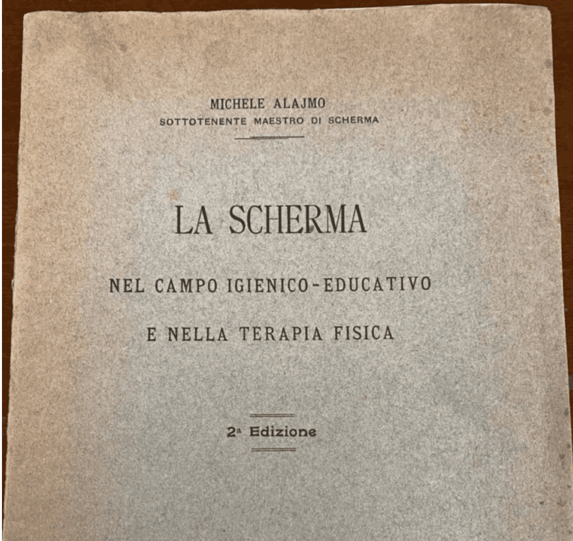Итак, речь идет об очень редкой книге маэстро Микеле Алайма 1926 года «Фехтование в области гигиеническо -образовательной и физической терапии» с личной его подписью.