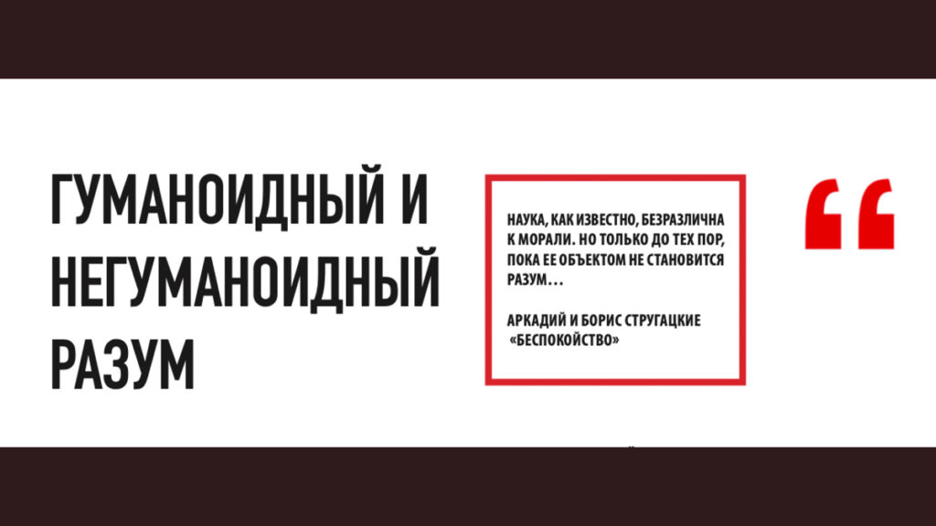 Да, мы люди; мы можем говорить о существовании разума с «человеческими» свойствами или гуманоидными (Human = человек). Но ведь это совершенно не означает, что гуманоидный разум – это единственно существующий разум, не так ли? В частности, те же Стругацкие приводят примеры и негуманоидного разума. Например, лес или, скажем, голубой туман. Туман ведь не человек, правильно? Но у фантастов он разумный. И читателя это не смущает.