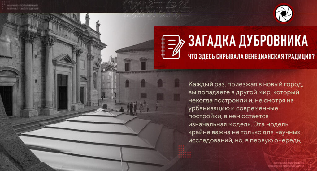 Дубровник, с этой точки зрения, оказался очень странным городом. За десятки экспедиций руководитель Экспедиционного корпуса академик Олег Мальцев ничего подобного не видел. В соседней Италии, особенно в Сицилии и в Калабрии, города построены по принципу двух моделей: «модель змеи» и «модель орла». Если вы видите город, над которым возвышается храм — этот город построен на основании модели змеи. Если над городом стоит рыцарский замок — мы имеем дело с моделью орла. Главный объект, замок или храм, находятся на холме, что заставляет вас подыматься наверх. В Дубровнике все наоборот, город будто спрятан внизу.