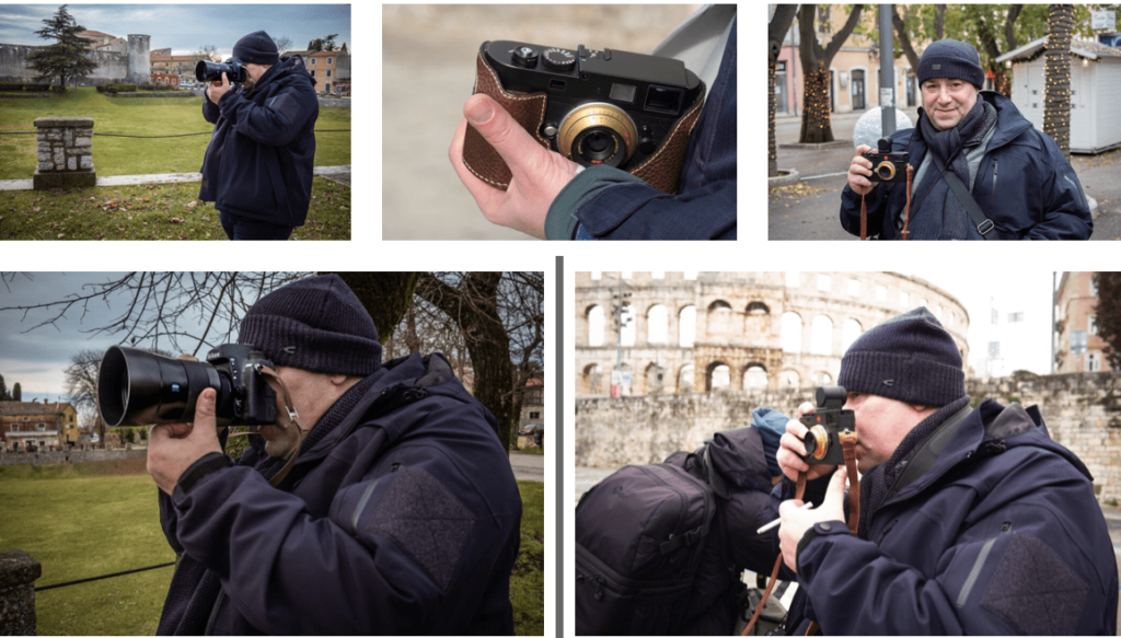 Экспедиционным корпусом было установлено стандартное фокусное расстояние, годное для экспедиции: 40 мм. Среднеформатный Фотоаппарат Voigtlander Bessa 667 имеет на своём борту объектив с фокусным расстоянием 80мм, что в пересчете на стандарт — полный кадр и является 43 мм, эта Камера одна из основных экспедиционных орудий. У члена ЭК Марины Ильюши объектив зуммированный, но при диапазоне 28-70 мм все исследовательские расстояния в наличии, что при опытном использовании даёт прекрасные результаты. Если мы идём от общего плана, то работаем широкоугольными объективами в зависимости от того, с чем мы имеем дело, но чаще всего это объектив 28 мм. Могут быть объективы 24 мм, ими хорошо снимать объемы площадей. Когда нам нужно работать со «стеклом», показать здоровенную площадь на 180 градусов, то берётся объектив 21 мм и шире. Я чаще всего работаю с объективом 21 мм, а бывает необходимость и в более широкоугольных, 17-18 мм, например, когда нужно показать не только объект, но и что его окружает. 50-мм объективом вы никак не снимете узкие улочки Палермо! У вас будут неприятности, храм целиком не поместится, сколько б вы не переходили на другую сторону улицы. А вот в Мюнхене наоборот, мы начинали с длиннофокусных объективов, 135 мм, потому что сразу увидели корабли на домах, и фотографировали символы, элементы, доказательства, которые в итоге должны были сложиться в общую мозаику, и дальше мы уже перешли к широкоугольным объективам.