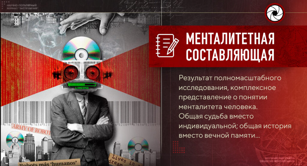 Менталитет — не абстрактная категория, осмысляемая сотнями ведущих мировых умов на протяжении нескольких веков, это категория особого порядка. Именно «менталитет» как феномен в 21 веке выступает главным препятствием на пути человека при разрешении жизненных задач. Этот элемент не только «сдерживает» человека, но и невидимо видоизменяет его, перестраивает взгляды и стремления, меняет невидимо, что обыкновено сам человек даже не замечает. В итоге ему предлагается общая судьба вместо индивидуальной; общая история вместо вечной памяти.