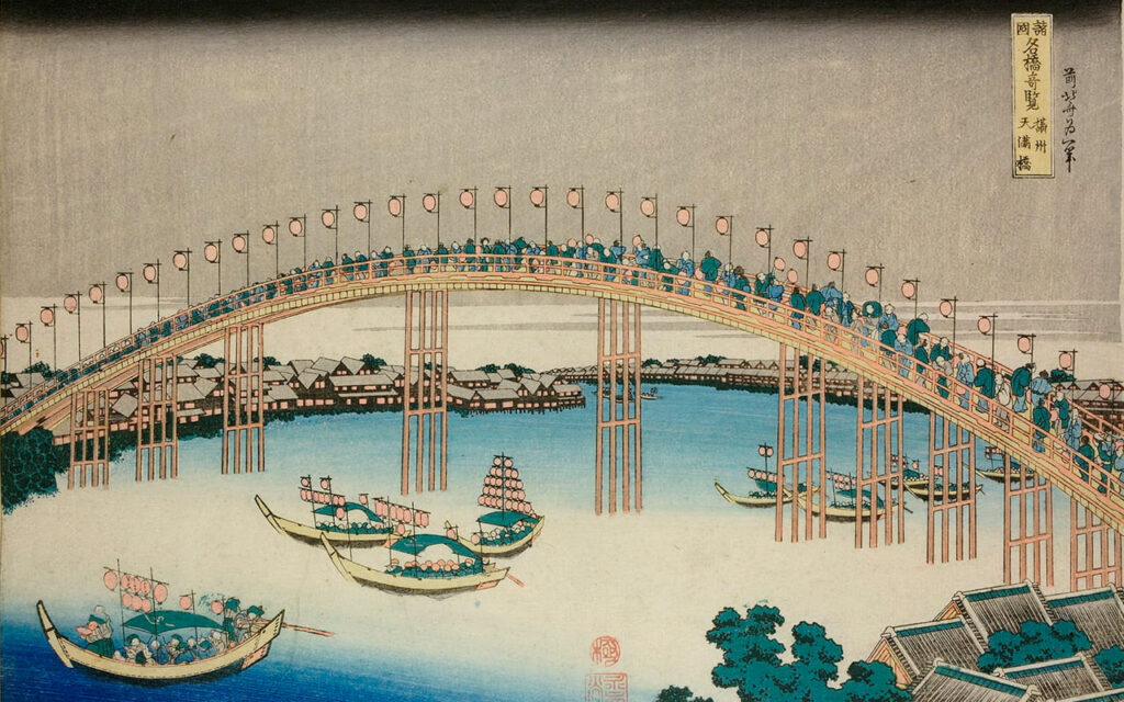 Картина отображает концепцию называемую в философии Японии «Удел большинства». На ней, как видим, через мост идет целая толпа людей, но мост ведет из одного города в другой. При этом, на заднем плане видим яркое отличие, там нет Фудзиямы, а лишь небольшой холм, что означает отсутствие Олимпа в жизни у этих людей. То есть, люди, идущие с толпой, будут всю жизнь довольствоваться тем, что есть, их выбор имеет ограничение, в нем нет Олимпа.
