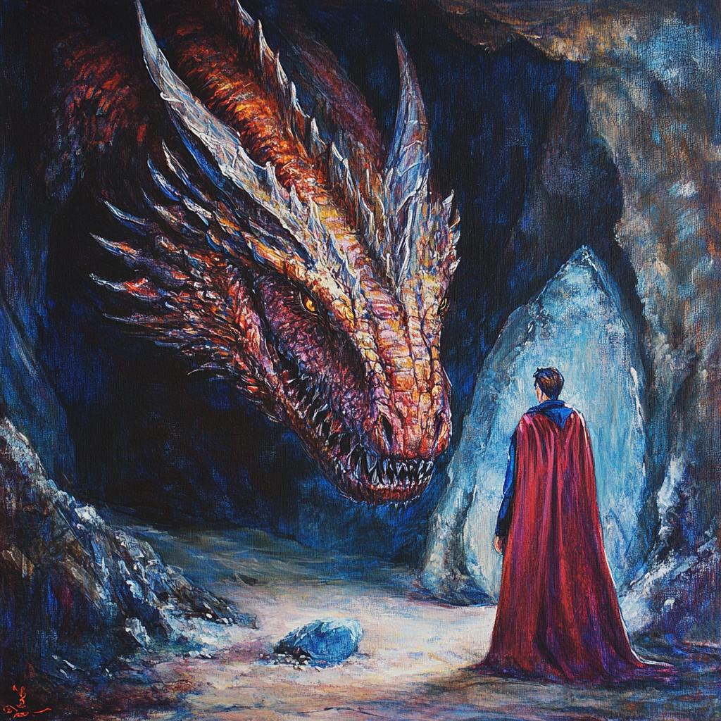 Когда князь вошел в пещеру, он увидел дракона, чья тень покрывала всю пещеру, создавая атмосферу страха и мрака. Перед драконом на каменном постаменте лежал Камень Всевластия, мерцающий магическим светом. Райнольд, не сомневаясь в своих требованиях, решительно подошел к дракону и, не дрогнув, возвестил громким голосом: