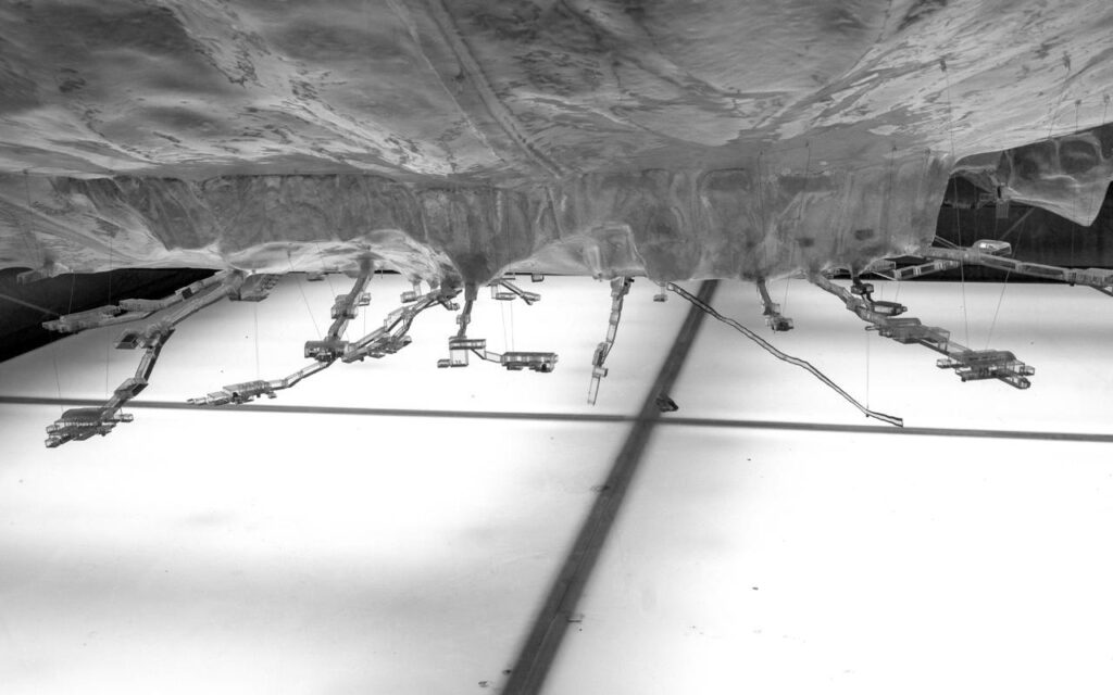 По форме отдаленно напоминает бокал: некий цилиндр, который увеличивается в плато — круглую подставку, которая ретрансформируется в большую (станина диаметром 3–4 метра может раздвигаться и достигать до 15–20 метров). На ней стоит вращающаяся система, от которой отходят 4 направляющих в разные стороны. Они имеют дисковую форму, как труба; каждая из них складывается вдвое. Внутри труб находятся резаки. Эта машина строит храмы. Она выпиливает основания, обелиски прямо из скалы, двигаясь вниз/вверх (до 50 м). Машина разбивает скалу, выпиливает заготовку, ее помещает в трубу и дальше все происходит в трубе: резаки предают заготовке форму.